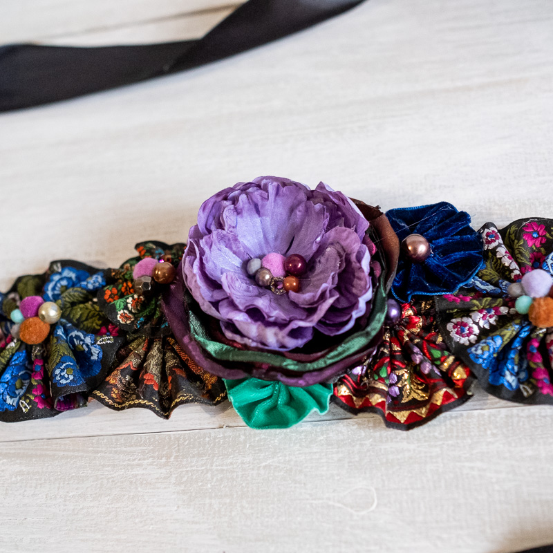Acest accesoriu marca Emilys este o explozie de culoare și imaginație oferindu-i ținutei tale un plus de valoare și creativitate. Brâurile sunt lucrate manual, pe o bandă de saten iar accesoriile florale sunt realizate din materiale diverse ca formă și textură având ca element central inserții de mărgele, cristale și pietre.