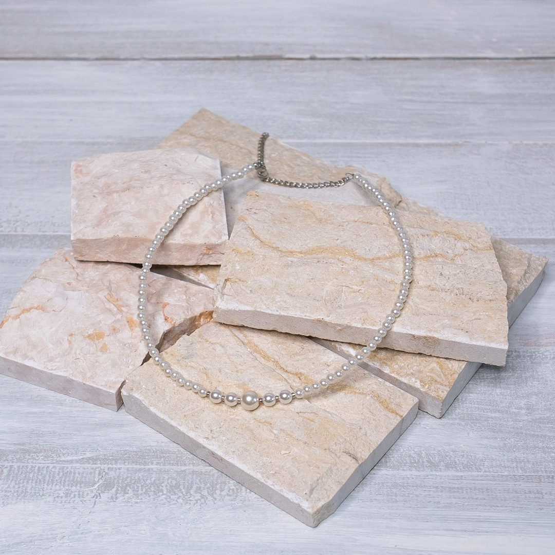 Un colier cu mărgele în stil minimalist, cu un design rafinat și versatil, care permite purtarea lui atât la ținutele casual cât și la cele elegante, fiind ideal pentru orice stil vestimentar.