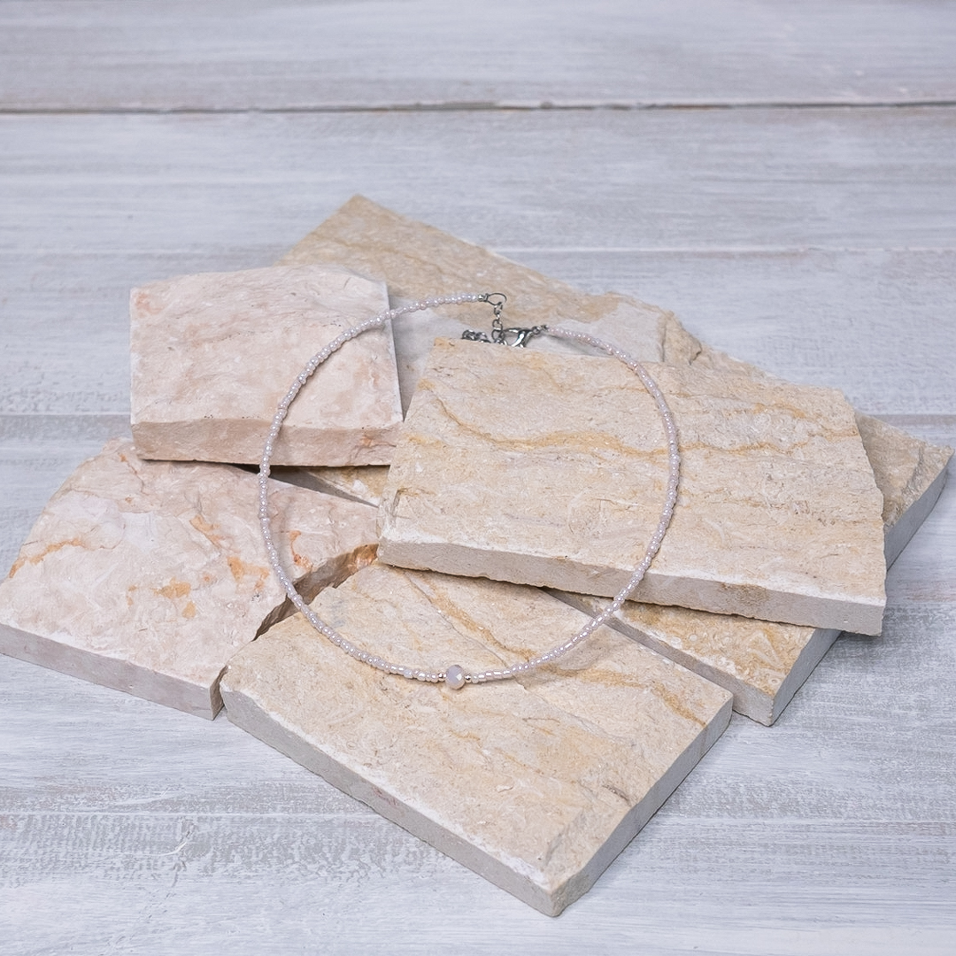 Aceste coliere cu mărgele, în stil minimalist, sunt realizate manual în propriul atelier . Designul lor rafinat și versatil permite purtarea lor atât la ținutele casual cât și la cele elegante, fiind ideale pentru orice stil vestimentar. Acestea sunt realizate din mărgele cermaice multicolore, combinate cu diverse cristale, bile de inox, perle sau pietre semiprețioase. Colierele sunt la baza gâtului având dimensiuni cuprinse între 35-37 cm și dispunând și de un lanț prelungitor de 6-8 cm, pentru a face purtarea cât mai confortabilă.