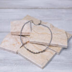 Aceste coliere cu mărgele, în stil minimalist, sunt realizate manual în propriul atelier . Designul lor rafinat și versatil permite purtarea lor atât la ținutele casual cât și la cele elegante, fiind ideale pentru orice stil vestimentar. Acestea sunt realizate din mărgele cermaice multicolore, combinate cu diverse cristale, bile de inox, perle sau pietre semiprețioase. Colierele sunt la baza gâtului având dimensiuni cuprinse între 35-37 cm și dispunând și de un lanț prelungitor de 6-8 cm, pentru a face purtarea cât mai confortabilă.