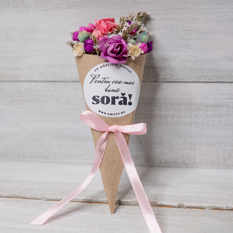Sunt realizate cu flori naturale uscate. Pot prezenta diferente de culoare fata de cele din fotografii, in functie de disponibilitatea materialelor folosite.